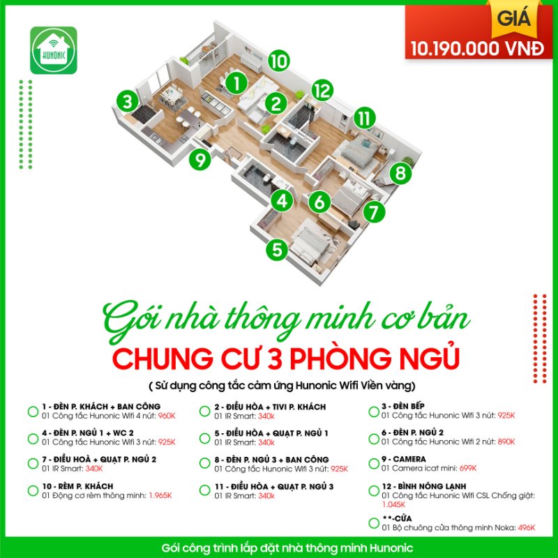 Trọn gói nhà thông minh Hunonic Cơ bản cho chung cư 3 phòng ngủ